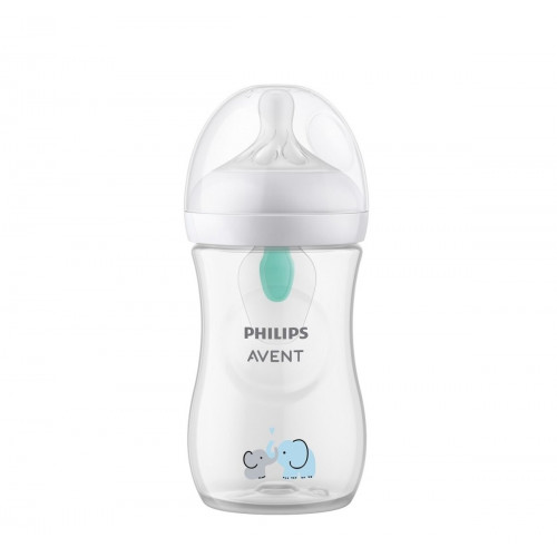 Fľaša Philips AVENT Natural Response s roztomilým obrázkom a s ventilom podporuje prirodzené kŕmenie a dokonale imituje dojčenie. Je vyrobená z materiálu PP (polypropylénu) bez bisphenol A ( 0% BPA ). Fľaša je číra, priehľadná a s presnou stupnicou. Ventil AirFree je navrhnutý pre dodatočnú ochranu proti možnému vzniku koliky vďaka tomu, že udržuje cumlík plný mlieka, nie vzduchu, pre jednoduchšie kŕmenie vo vzpriamenej polohe s menším rizikom prehltnutia vzduchu. Súčasťou je cumlík z mäkkého silikónu, ktorý funguje rovako, ako keby dieťatko pilo z matkinho prsníka a uvoľňuje mlieko len vtedy, keď dieťa aktívne pije. Ventil znižuje výskyt koliky a je navrhnutý tak, aby udržiaval vzduch mimo bruška Vášho bábätka, a tým pomáhal zmierniť koliku a nepohodlie. Deti tak môžu piť, prehĺtať a dýchať vo vlastnom rytme, podobne ako na prsníku, čo uľahčuje kombináciu dojčenia a kŕmenia z fľaše. Samotná fľaša má ergonomický tvar a široké hrdlo uľahčuje plnenie a čistenie.