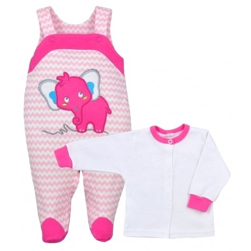 Súčasťou súpravičky je kabátik a dupačky. Kabátik je jednofarebný s farebným lemovaním okolo rukávov a krku. Dupačky zdobí veľký obrázok roztomilého slona a zik zak vzor. Zapínanie na cvočky v prednej časti a medzi nožičkami.