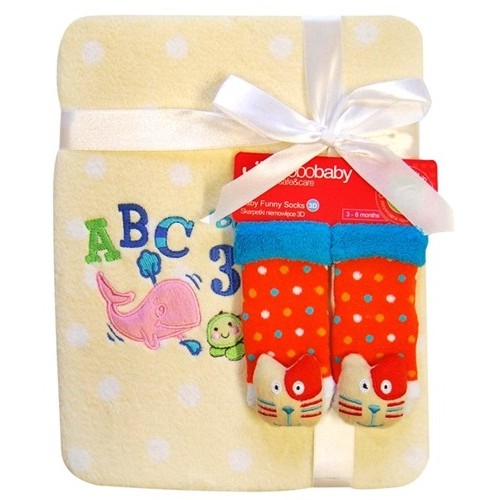Detská deka z mikrovlákna Bobo Baby s veľkým našitým obrázkom a motívom roztomilých bodiek. Teraz naviac s kojeneckými ponožtičkami. Kvalitný materiál, ktorý nepúšťa farbu a nevyvoláva alergické reakcie. Rozmery deky cca 76x102 cm. Zloženie 100% polyester. Ponožky sú vhodné pre deti od 3-6 m. Zloženie - 85% bavlna, 10% polyamid, 5% elastan.
