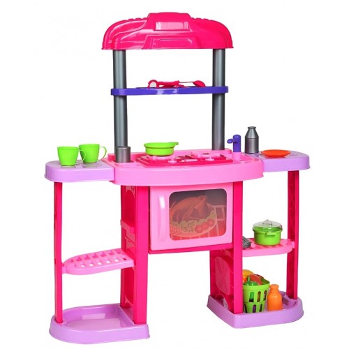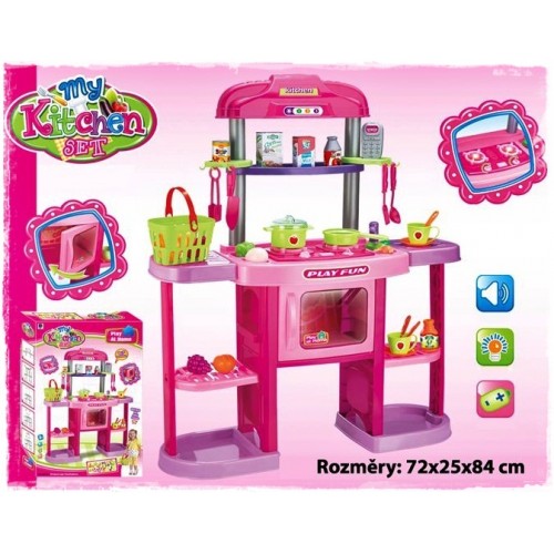 Detská kuchynka Bayo Kuchynka obsahuje sporák s horákom, ktorý vydáva zvuky a svieti, mikrovlnnú rúru, riad, príbory, ovocie, zeleninu, makety kartónov s cereáliami, nápojmi či nákupný košík. - úžasná hračka pre malé gazdinky, - súčasťou je sporák s horákom a zvukom, volič teploty, - mikrovlná rúra s otváracími dvierkami, - celkom 32ks príslušenstva, - vyrobené z kvalitného plastového materiálu, - napájanie dvomi 1,5V batériami typu AA (nie sú súčasťou balenia), - určené pre detičky od cca 3 rokov Rozmery - VxŠxH cca 84x72x25cm