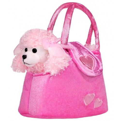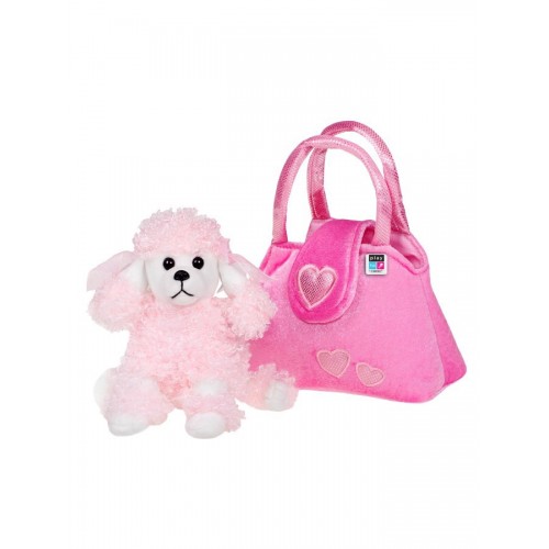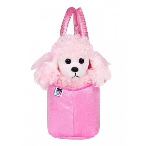 Psík je vyrobený z jemného plyšu. Má krásne a jemné kučierky a na uškách ozdobné mašličky. Taška sa zapína na suchý zips, je zdobená obrázkami srdiečok a nápisom Smile. Je vyrobená z jemného semišu. Ušká na taške sa jemne ligocú.