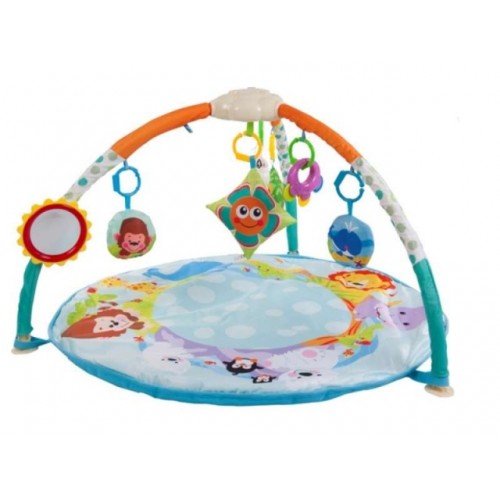 Rozvojová podložka Sun Baby, Planéta zvierat pomáha rozvíjať zmysly ako hmat, zrak a sluch dieťatka a súčasne aj jeho predstavivosť. Vaše dieťatko výborne zabaví. Pútavo na dieťatko pôsobia aj pestré a živé farby. Na hrázdičke sú umiestnené mäkké hračky, zrkadielko a hrkálky. Hračky je možné z hrazdičky odopnúť a vymeniť za iné závesné hračky, prípadne sa s nimi dieťatko môže hrať samostatne. Samotná hracia deka je z príjemného a mäkkého materiálu s velelými farebnými obrázkami a pre dieťatko je bezpečná. Dečka je vhodná pre detičky vo veku od narodenia.