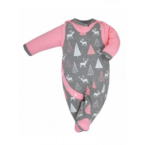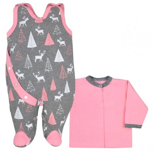 Súčasťou súpravy je kabátik s dlhým rukávom a dupačky. Detské dupačky sú celopotlačené obrázkami srnčekov, stromčekov a sú zaujímavé aj falošným bočným zapínaním s farebným lemom. Dupačky majú zapínanie na cvočky na ramienkach a medzi nožičkami. Kabátik je jednofarebný v krásnych svetlých farbách. Okolo krku a ručičiek má sivý lem. Zapínanie na cvočky.