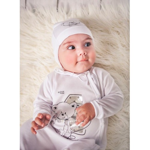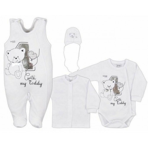 Súpravička je vyrobená z veľmi príjemného, mäkkého a kvalitného materiálu, ktorý je vhodný pre bábätká. Obsahuje body s dlhým rukávom, dupačky, kabátik a čiapočku. Body je celorozopínacie a zdobí ho obrázok medvedíka s nápisom with my Teddy. Dupačky zdobí veľký roztomilý obrázok medvedíka s nápisom with my Teddy. Zapínanie na cvočky na ramienkach a medzi nožičkami uľahčí obliekanie aj prebaľovanie. Kabátik je jednofarebný a okolo krku a ručičiek má lem. Zapínanie je po celej dĺžke. Čiapočku zdobí obrázok hlavy medvedíka. Je veľmi praktická, zaväzovanie na šnúrky a po obvode má široký pružný lem, ktorý krásne kryje ušká bábätka. V tejto kvalitnej súpravičke sa bude bábätko cítiť príjemne. Súpravička je v praktickej Eko krabičke a preto je vhodná aj ako milý darček.